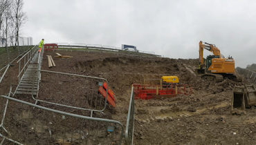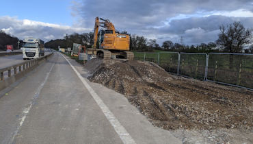 This bay is similar to bay 03: the carriageway is being built out with a stepped formation detail, and 1,600t of imported aggregate to widen the embankment.
