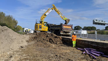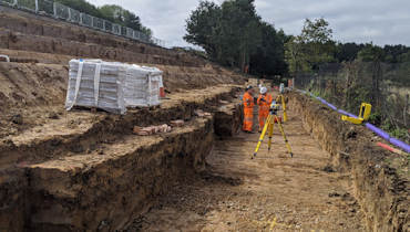 The drainage connections required excavations up to 5.5m deep, for which we used large excavation supports. The excavated London clay was removed from site, with some clay being dried out in windrows for reuse as backfill.
